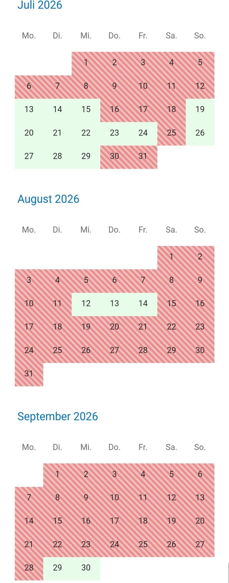 an den rot gestreiften Tagen, und rote Zahl ist die Fewo belegt.